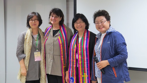 韓國長老教會(PROK)議長Rev. Young Ju, Park(右一), 致贈彩色肩帶給Mission21總幹事Rev. Claudia Bandixen(左二) 及PCT總會婦女幹事連嫦美牧師(右二)。(林佳靜攝) 4月14日上午,Mission21亞洲團契,來自瑞士、日本、韓國、印尼的蘇拉維西(Sulawesi)島、馬來西亞的沙巴等教會機構的女性牧者、領導幹部參訪PCT總會事務所,聽取總會婦女事工委員會簡報。總會客家宣教委員會幹事賴德卿牧師也特別感謝Mission21的前身巴色差會,曾差派宣教師到台灣客家族群宣教。賴牧師並於現場清唱一段客家聖詩讓眾姊妹聆賞。