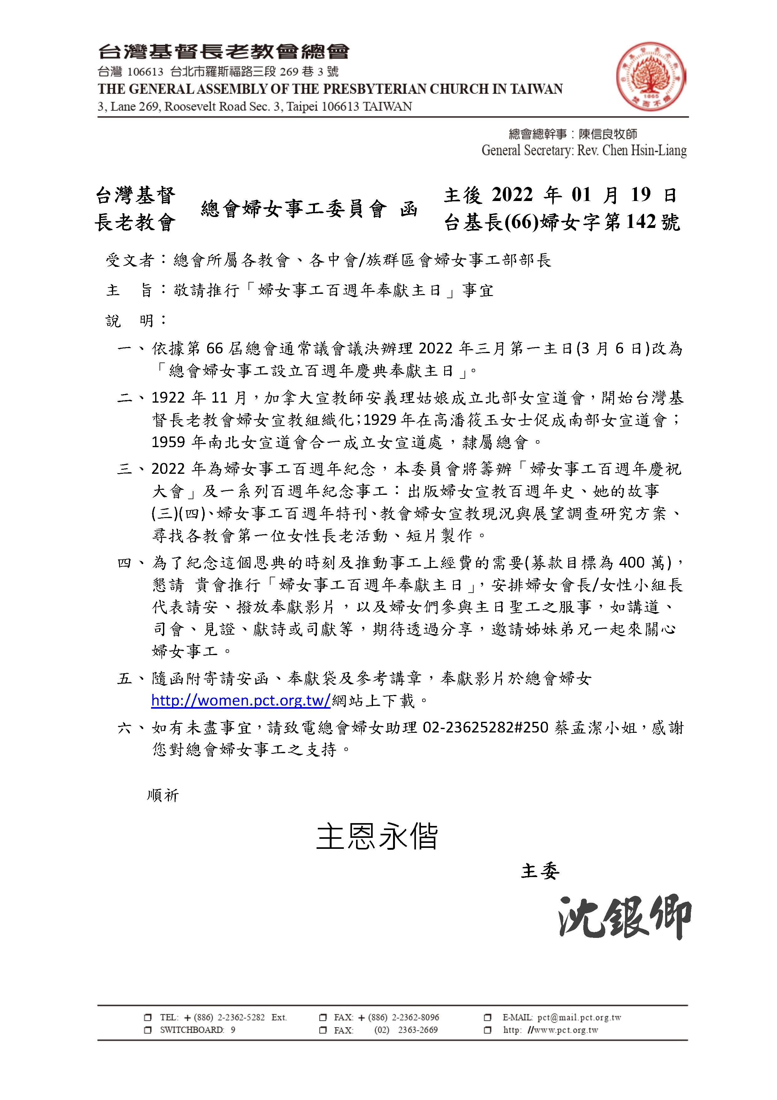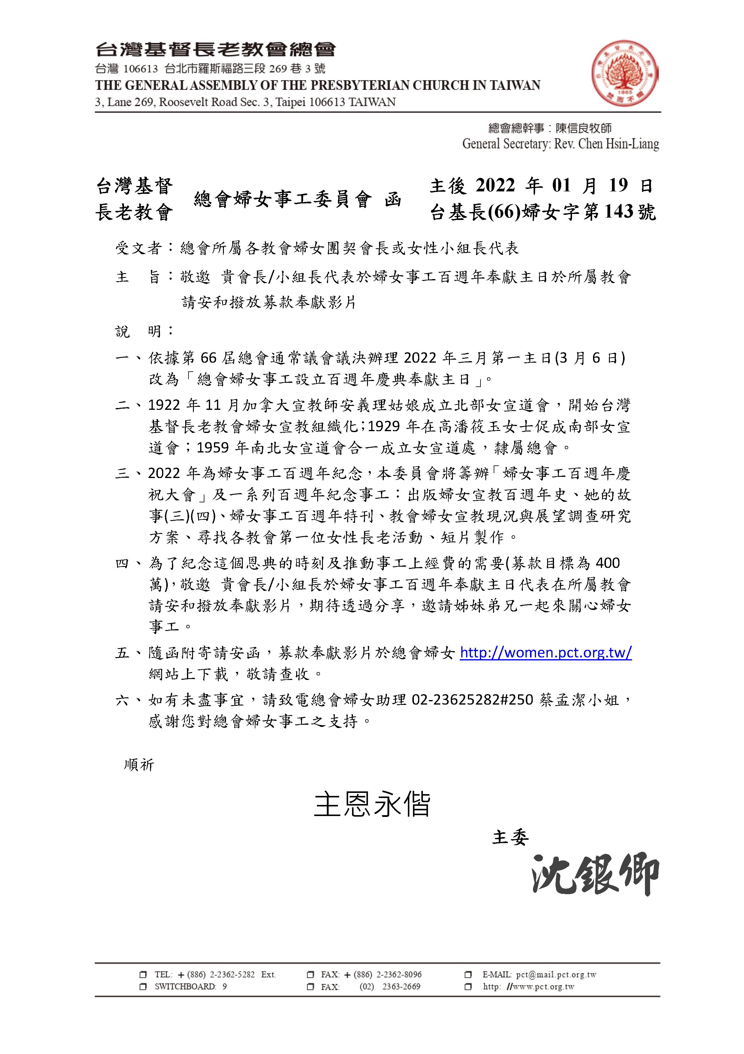 主內敬愛的牧長、婦女團契會長/女性小組長、姊妹兄弟,平安! 1922年11月,加拿大宣教師安義理姑娘成立北部女宣道會, 開始台灣基督長老教會婦女宣教組織化; 1929年在高潘筱玉女士促成南部女宣道會; 1959年南北女宣道會合一成立女宣道處,隸屬總會。 2022年為婦女事工百週年紀念,本委員會將籌辦「婦女事工百週年慶祝大會」 及一系列百週年紀念事工。依據第66屆總會通常議會議決辦理 2022年三月第一主日(3月6日)改為「總會婦女事工設立百週年慶典奉獻主日」。 為了紀念這個恩典的時刻及推動事工上經費的需要(募款目標為400萬), 懇請 貴會推行「婦女事工百週年奉獻主日」, 邀請姊妹弟兄一起來關心婦女事工。 順頌主恩永偕。 PCT總會婦女事工設立百週年慶典奉獻主日影片https://www.youtube.com/watch?v=1S-uwhyMXzk